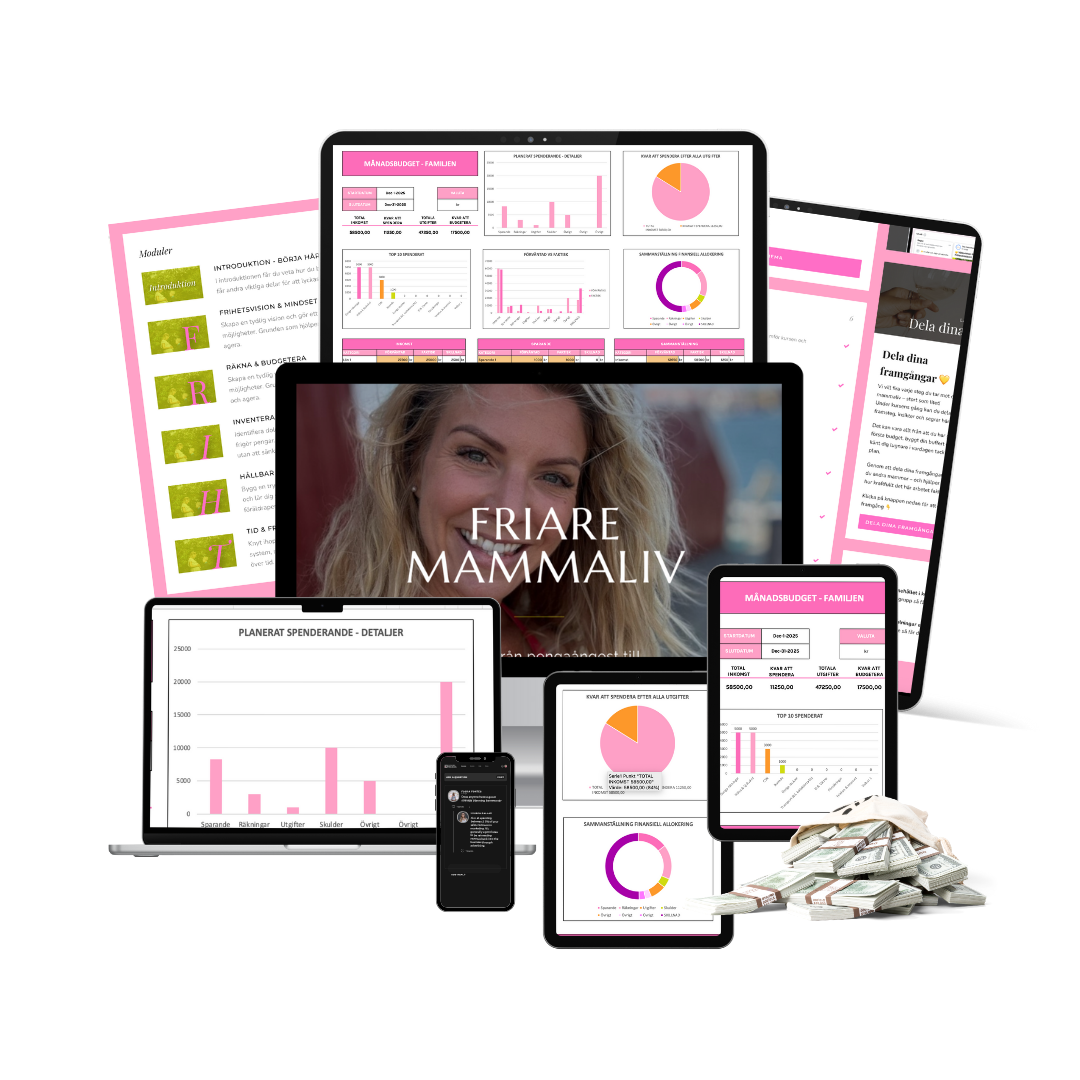 Friare Mammaliv är en kurs för dig som vill skapa struktur, trygghet och långsiktig frihet i din ekonomi.